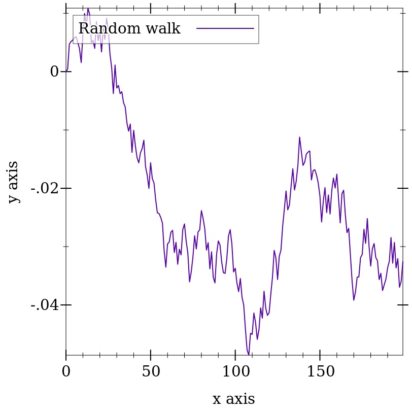 > (plot (lines (reverse (for/fold ([lst (list (vector 0 0))]) ([i (in-range 1 200)]) (match-define (vector x y) (first lst)) (cons (vector i (+ y (* 1/100 (- (random) 1/2)))) lst))) #:color 6 #:label "Random walk"))
