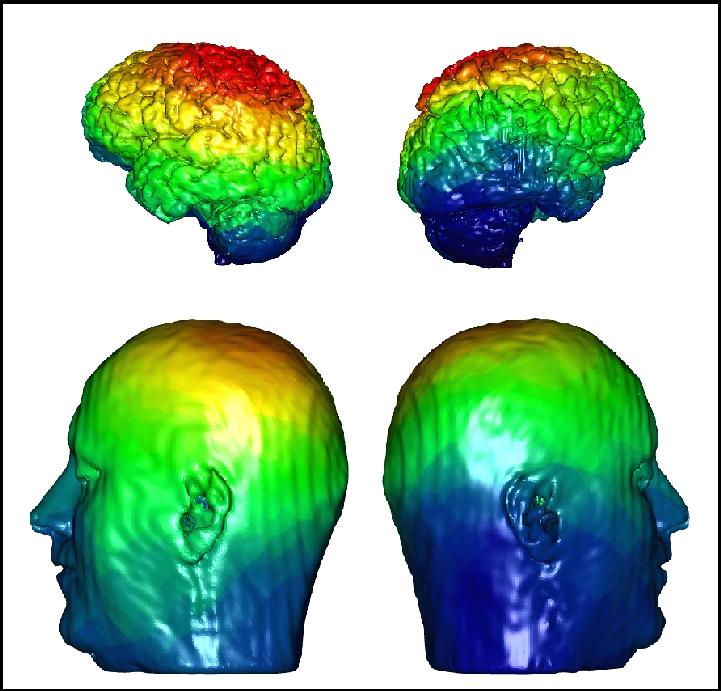 the surface of the brain (top) and surface of the scalp (bottom) from